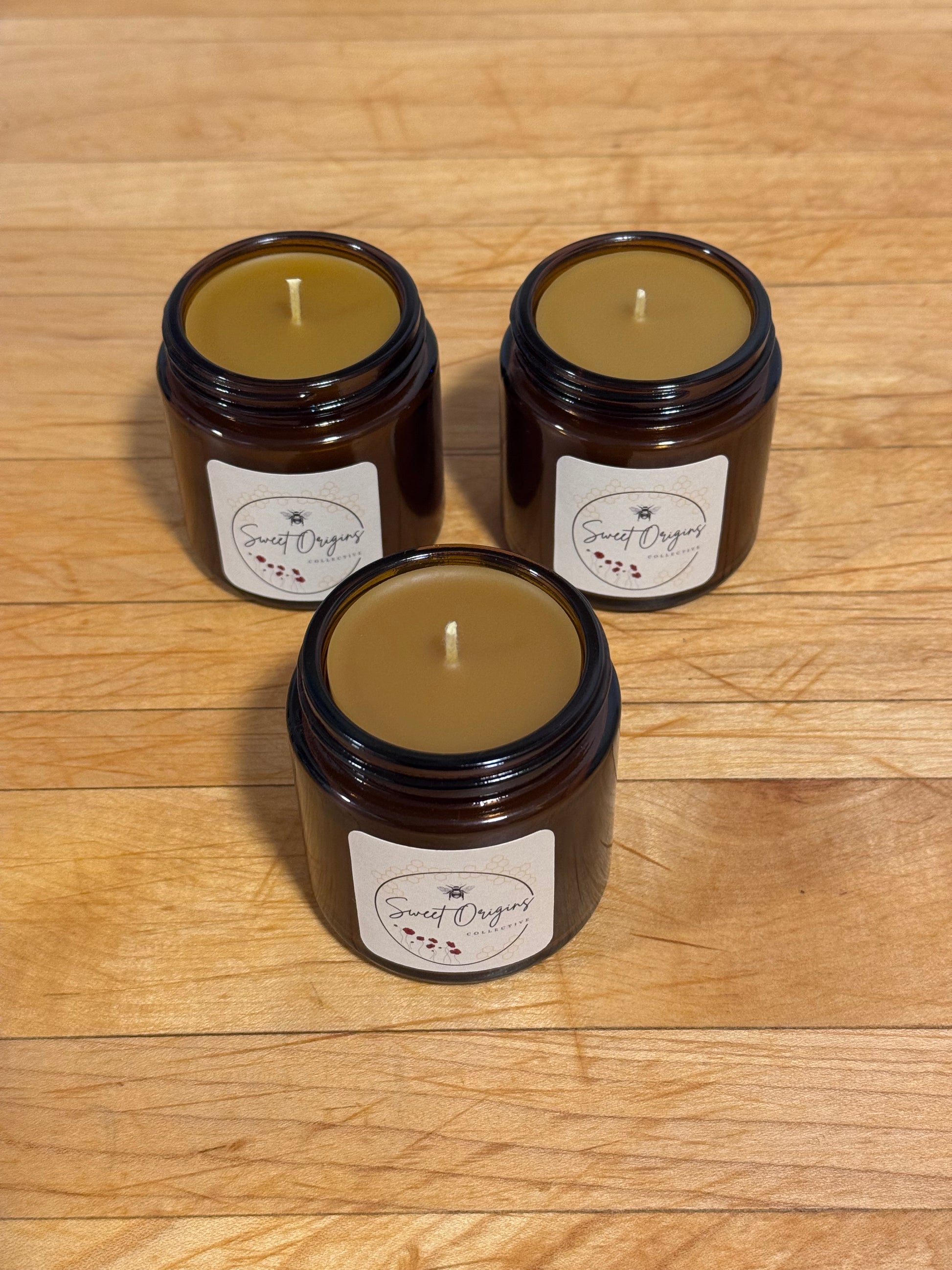 Pure beeswax candle in a 4 ounce amber glass jar. Handcrafted in Idaho.