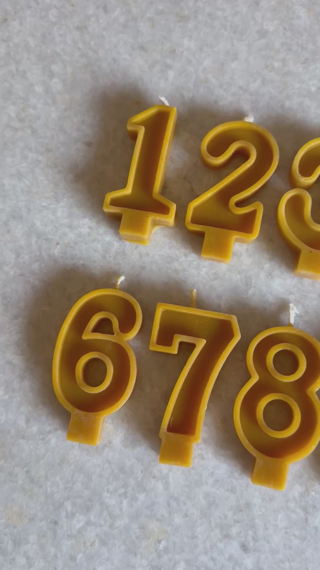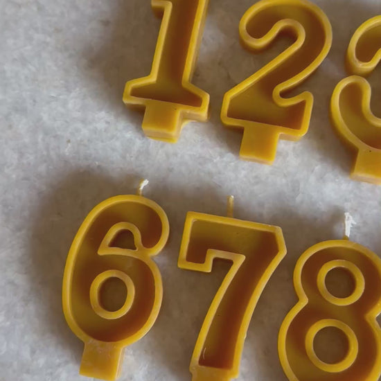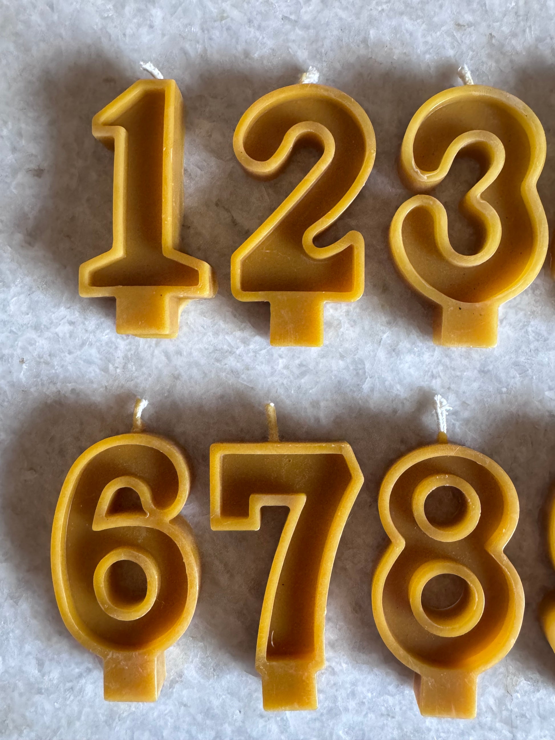 Pure beeswax birthday number candles, handcrafted in Idaho, .5 ounces each.