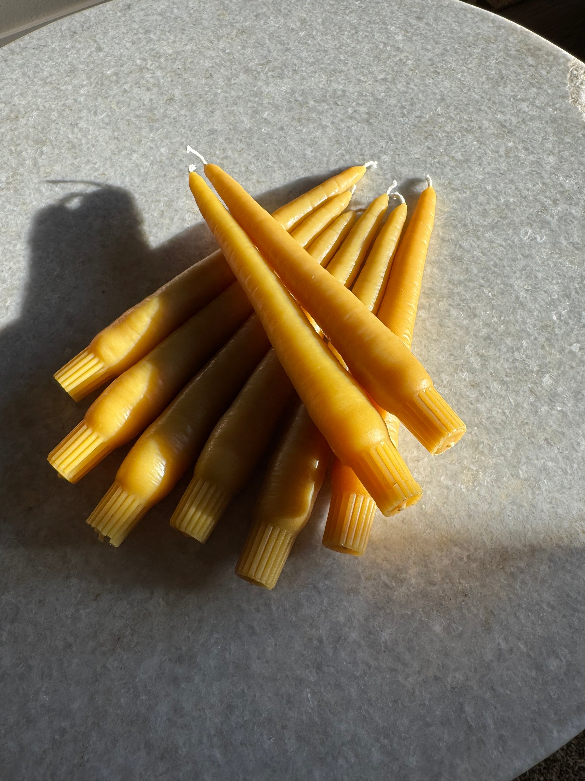 Beeswax 8.5” carrot taper candle, handcrafted in Idaho, 2 ounces.