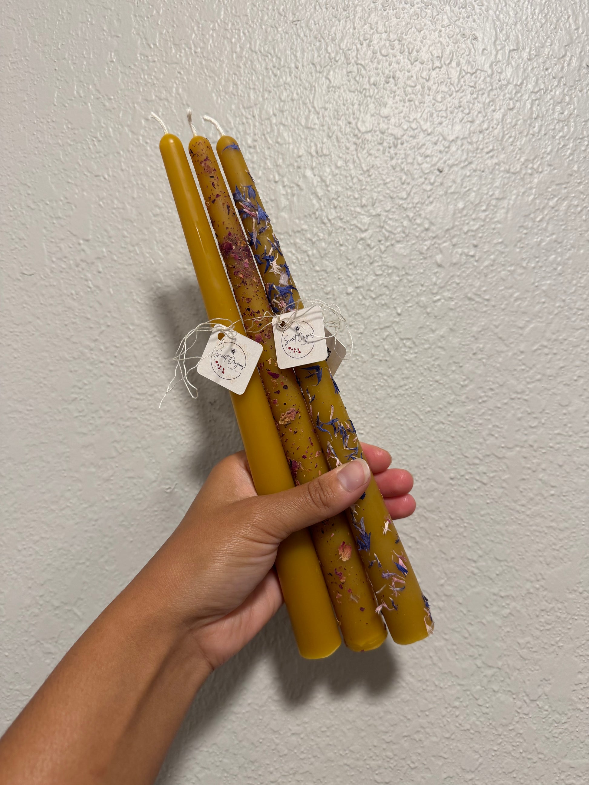 Beeswax 10” single taper candle, handcrafted in Idaho, 2 ounces. Choose from simple, dried rose petals, or blue cornflower.